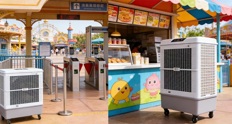- 布局方式:在游乐设施入口/等候区两侧,单台摆放(避免多台拥挤),距离设施围栏1.5-2米,朝向排队人群送风;