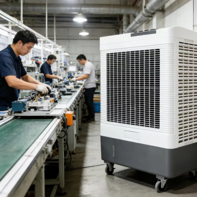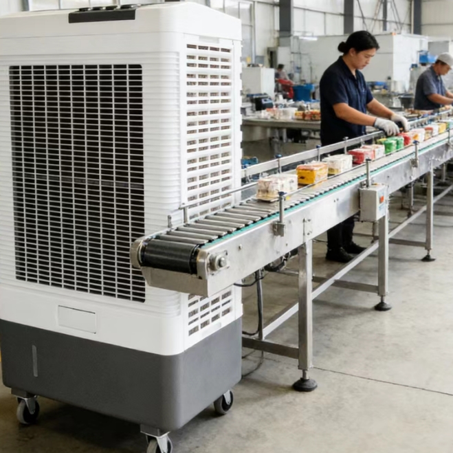 工业车间普遍存在空间开阔、设备产热高、人流密集等特点,夏季高温易导致工人体感不适、效率下降,甚至引发中暑风险。传统中央空调安装成本高、能耗大,且无法适配开放式车间;普通风扇仅能加速空气流动,无实质降温效果。